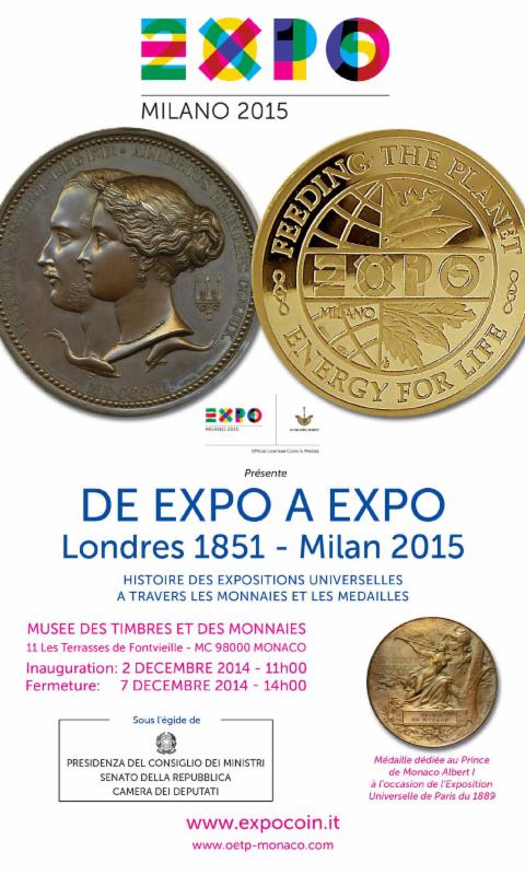 Se déroule du 2 au 7 décembre 2014 l'avant-première internationale de l'exposition officielle "De Expo à Expo – Londres 1851 – Milan 2015 – Histoire des Expositions Universelles à travers les monnaies et les médailles».
