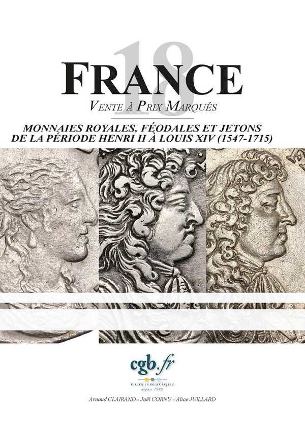 France 18, notre dernier catalogue thématique, est consacré aux monnayages royaux d'Henri II à Louis XIV (1547-1715) et au monnaies féodales et jetons frappés durant le règne de Louis XIV (1643-1715). Le choix d'un tel thème est en rapport avec tricentenaire de la mort de Louis XIV et les différents événements qui ponctueront cette année.