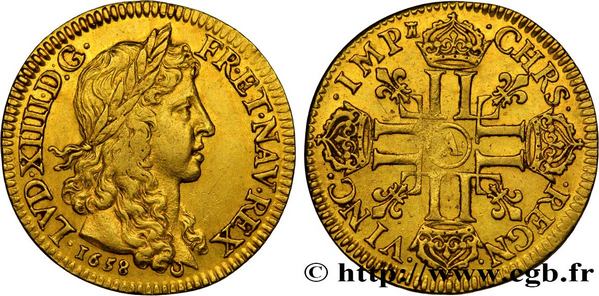 Louis XIV, Louis d'or juvénile lauré, 1658, Paris. Exemplaire provenant de la collection L.G. TTB+, prix de départ 1 800 €.