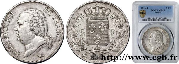 5 francs Louis XVIII, tête nue, 1819, Limoges, F.309/43. Exemplaire de la Collection Idéale. Cette monnaie n’a jamais été vue par George Sobin. TTB / XF 45, prix de départ 5 000 €.