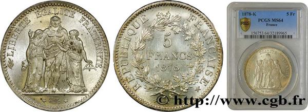 5 francs Hercule 1878, Bordeaux, F.334/23. Exemplaire provenant de la Collection DK. SPL / MS 64, prix de départ 500 €.