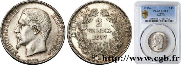 2 francs Napoléon III, tête nue, 1857, Paris, F.262/9. De qualité équivalente à l’actuel exemplaire de la Collection Idéale. SPL / MS 64, prix de départ 1 400 €.