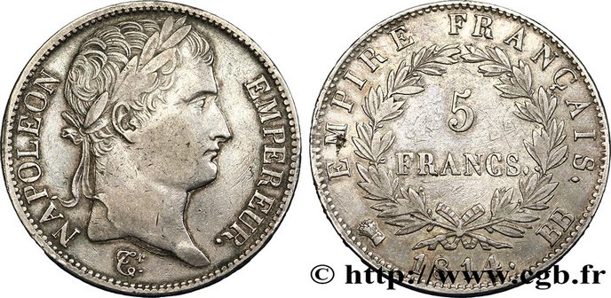 5 francs Napoléon Empereur, Empire français, 1814, Strasbourg, F.307/78. Exemplaire de la Collection Idéale. C’est la première fois que nous proposons cette monnaie à la vente. TTB 48, prix de départ 2 000 €.