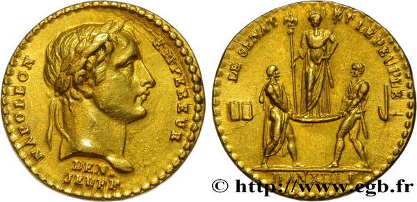 Vous découvrirez pour finir un rare quinaire en or pour le sacre de l'empereur mis à prix à 300 euros. Ce petit jeton que l'on trouve facilement en argent est beaucoup plus rare en or (lot fjt_401997).