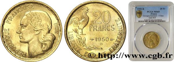 20 francs Georges Guiraud 1950 Beaumont-Le-Roger F.401/3 PCGS MS65. Variante avec la queue du coq à quatre faucilles.