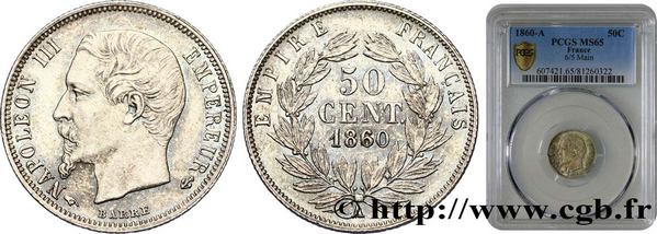 50 centimes Napoléon III, tête nue 1860 Paris F.187/12 MS65. Exemplaire en 1860/50. Nouvel exemplaire de la Collection Idéale.