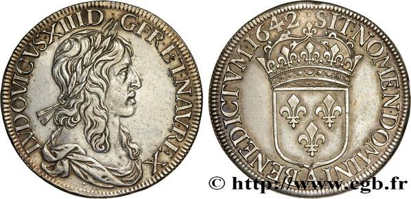 Louis XIII – Écu d’argent, 2e type, 1er poinçon de Warin, 1642 Paris, Monnaie du Louvre, TTB+/SUP. Prix de départ 3 000 €.