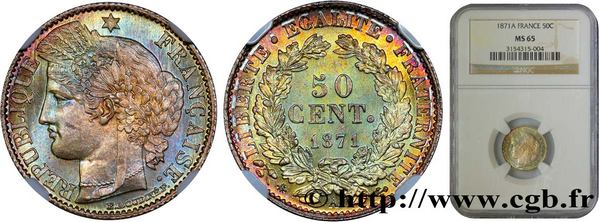 50 centimes Cérès, IIIe République, 1871, Paris, F.189/1, sous coque NGC MS65. Prix de départ 340 €.