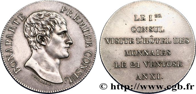 Monnaie de visite, module de 5 francs, pour la visite de Bonaparte à l’hôtel des Monnaies de Paris, 1803, Paris, VG.1203, SUP. Prix de départ 1 400 €.