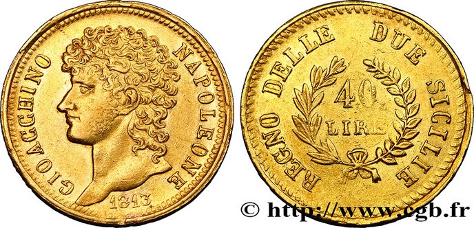 Royaume de Naples – Joachim Murat, 40 Lire or, rameaux longs, 1813, Naples, TTB. Prix de départ 450 €.