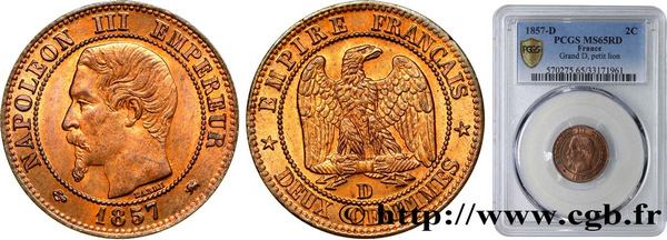 Joli succès pour cette deux centimes Napoléon III, tête nue, Grand D, Petit Lion, 1857, Lyon. Quatre enchérisseurs et un prix d'estimation presque atteint.