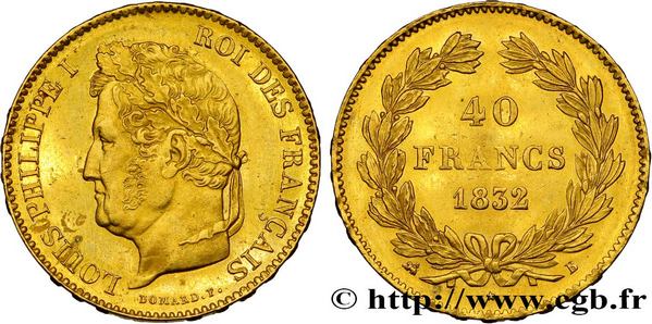 Beau score pour cette superbe 40 Francs Or frappée en 1832 à Rouen au nom et à l'effigie de Louis Philippe. Prix d'estimation 1 800 € dépassé avec un  prix final à 2 500 € (+ frais).