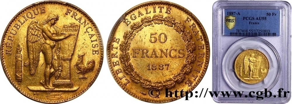 Ainsi que la rarissime 50 Francs Or Génie de 1887 Paris, frappée à seulement 301 exemplaires.