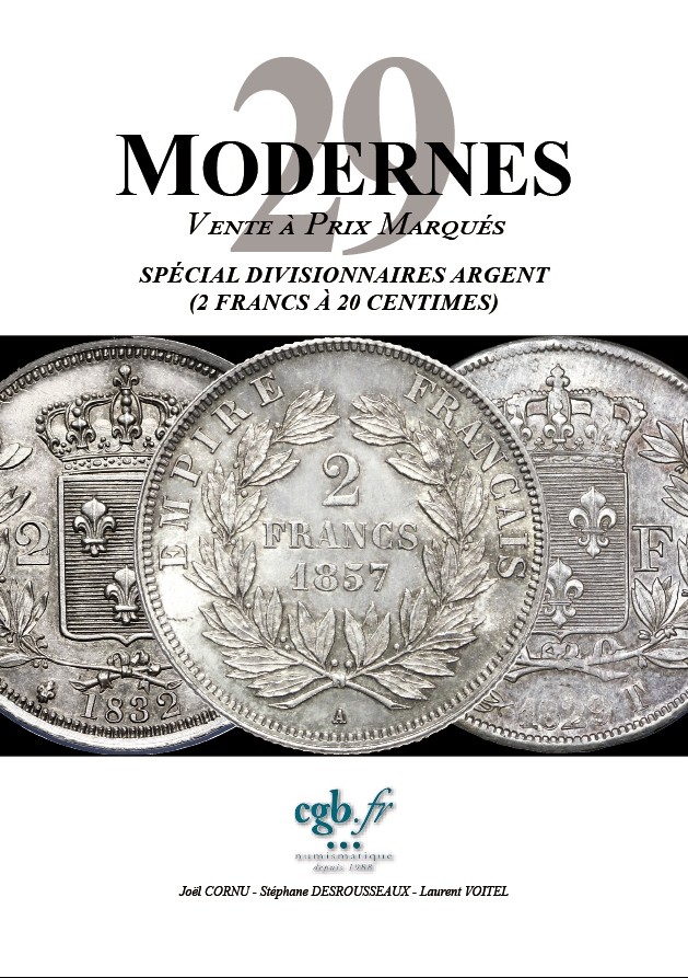 Nouvelle année, nouvelle thématique. Après avoir fait le tour des valeurs faciales en 2013 et en 2014, nous vous proposons dans MODERNES 29 un nouvel aperçu de la numismatique moderne française sous l'angle, cette fois-ci et pour la première fois, des divisionnaires en argent. Activement recherchées, ces monnaies sont souvent très rares en raison d'un nombre parfois restreint d'ateliers de frappe et de faibles quantités fabriquées. Vous y trouverez les pièces de 2 francs, de 1 franc, de ½ franc, de 50 centimes, de ¼ franc, de 25 centimes et de 20 centimes, sans oublier les piéforts et les commémoratives de la Monnaie de Paris inférieurs à la pièce de 5 francs.