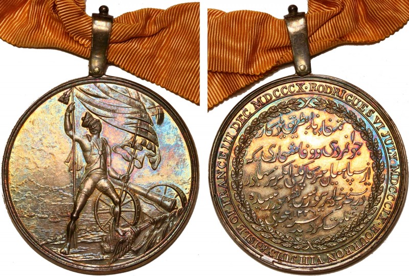 La médaille présentée aujourd'hui vient tout juste d'être en ligne et bénéficie ainsi de la rubrique Une semaine, une médaille ! ; il s'agit d'une spectaculaire médaille en argent frappée en 1811 par la "Honble. Inde Co. East", pour la prise de Rodrigues et des Îles de Bourbon de France par les anglais.